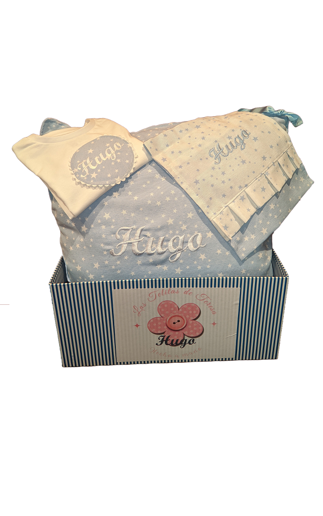Canastilla personalizada, confeccionada con telas de estrellas. Compuesta por cojín de 50 cm, camiseta de manga corta y bolsita de merienda.