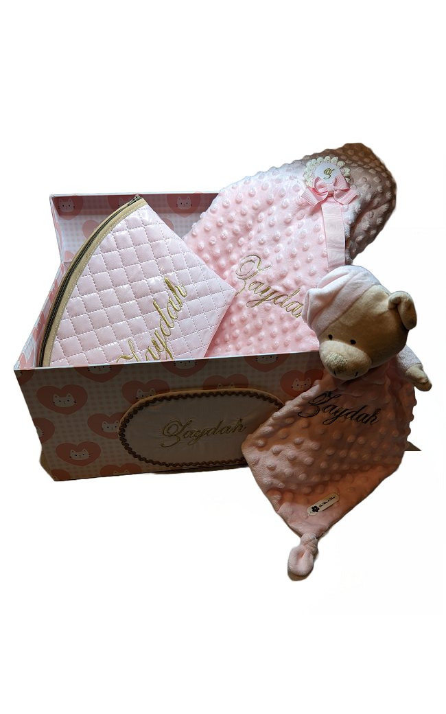 Canastilla personalizada compuesta por manta, chupetero, doudou, caja y neceser.
