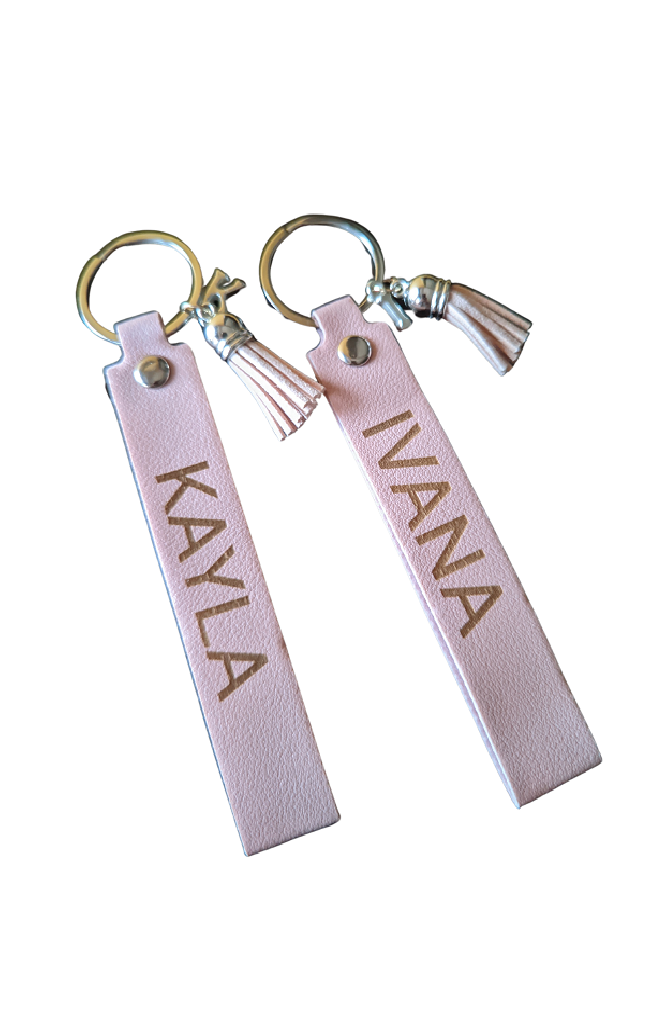 Llaveros de cuerina decorados con borla, personalizados con nombre grabado con láser e inicial metálica.