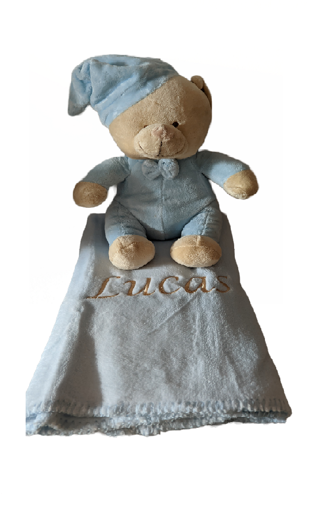 Peluche con forma de oso y manta a juego personalizada con bordado.