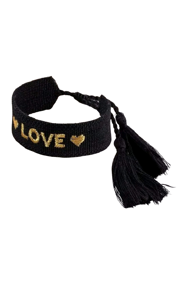 Pulsera confeccionada en hilo negro, decorada con borlas en las terminaciones y la inscripción LOVE en dorado.