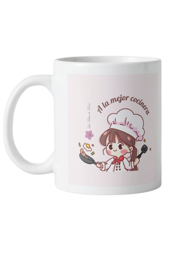Taza de cerámica con imagen de cocinera y texto «A la mejor cocinera»